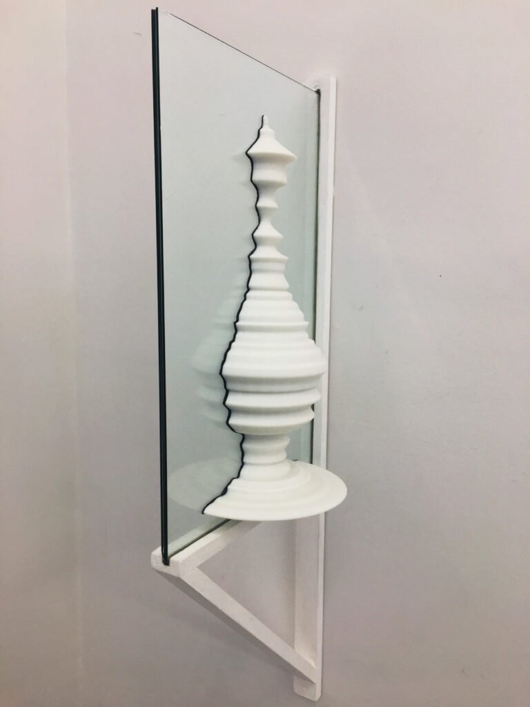 From a graphic representation of the heart’s electrical activity — an electrocardiogram — a 3D volume is generated and printed. But the work is only complete in the reflection: the glass doubles the volume, creates its symmetry, its invisible and inseparable part. This complement cannot be touched, grasped, possessed — it exists only in the relationship between the object and its reflection.