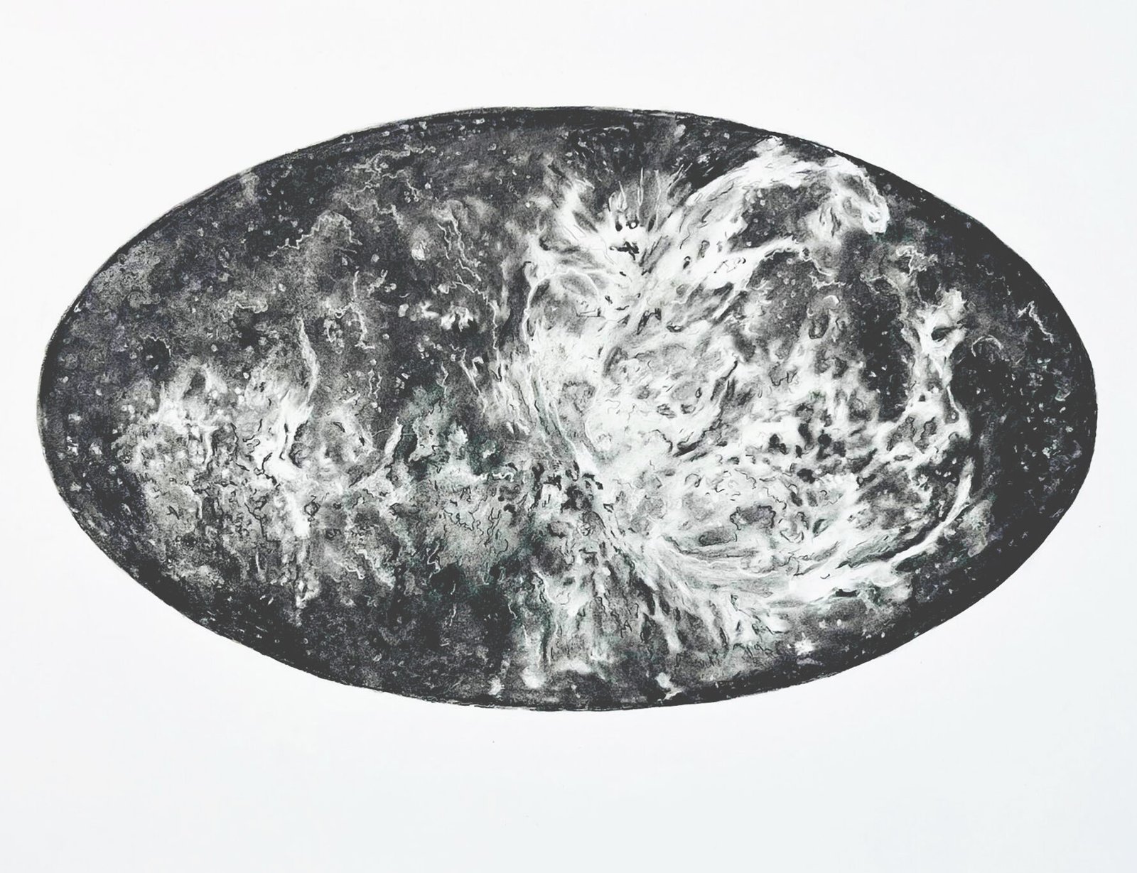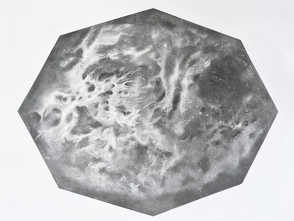 Dessiner la nébuleuse d’Orion au charbon — c’est tracer le cosmos avec sa propre matière. Le carbone est l’élément fondamental du vivant et des étoiles : le même atome qui compose nos cellules compose les étoiles qui meurent et se reforment. La poussière des étoiles et la poussière du dessin ne font qu’un. Le geste du dessin devient un acte de reconnaissance — la matière consciente qui trace la matière cosmique dont elle est issue. Un retour à l’origine inscrit dans le noir du charbon.